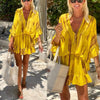 Gelbes, transparentes, seidiges Strandkleid mit tiefer Taille
